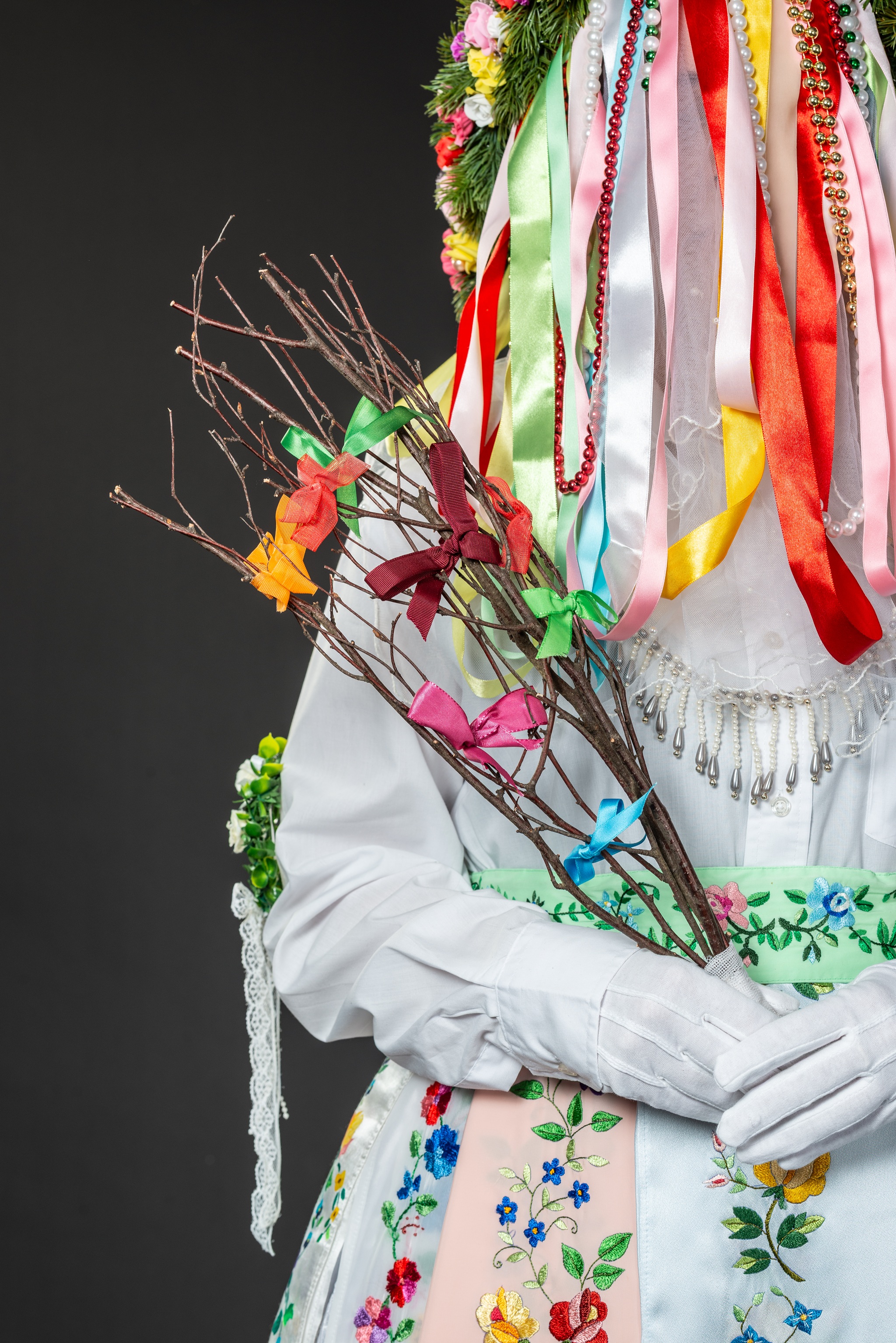 Besonders kostbar ist das bestickte Seidenkopftuch (wušywana lapa) aus verschiedenfarbiger Seide mit pastellfarbenen Stickereien, ergänzt durch ein dekoratives besticktes Halstuch.